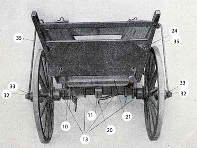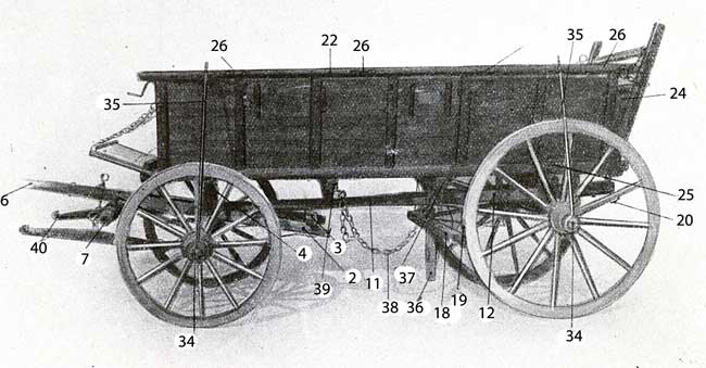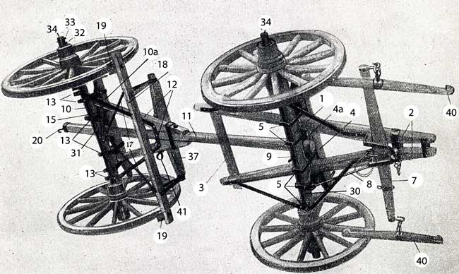 Die Vorder- (30) und die Hinterachse (31) lagern in den hölzernen