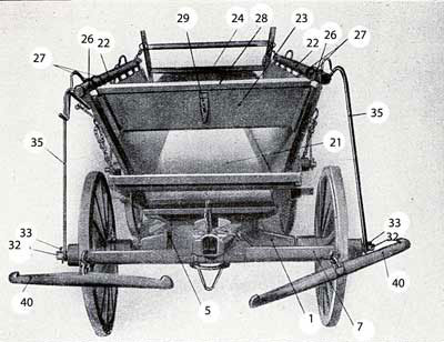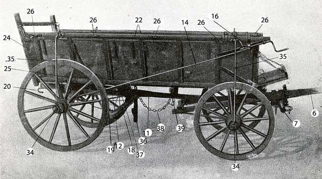 Wagenkastens. Fußbrett und Schoßkelle sind in eisernen, an den unteren Leiterbäumen befestigten Haken beweglich gelagert und werden durch Ketten in der jeweils erforderlichen Lage fixiert. Zu diesem Zwecke sind an den vordersten Leiterschwingen sowie am rückwärtigen Ende der oberen Leiterbäume eiserne Ringe angebracht. Um zu verhindern, daß die Seitenwände durch die verladene Last auseinandergedrängt werden, sind die oberen Leiterbäume durch eine hinter der Sitztruhe angebrachte Schlüsselkette verbunden. Die oberen Bretter der beiden Seitenwände sind in der Mitte geteilt, an den Leiterschwingen abnehmbar befestigt und können als Sitzbretter verwendet werden; die unteren Bretter der Seitenwände sind mit den Leiterschwingen fest verschraubt. Die beiden unteren Leiterbäume sind an einer Stelle durch den Sattelsteg (39) miteinander fest verbunden. Der Wagenkasten ruht vorne und rückwärts auf den Kipfstöcken auf und durch vier Daumnägel (25) der Kipfstöcke, die in entsprechende, an den unteren Leiterbäumen angebrachte Ösen eingreifen, in seiner Lage festgehalten. Die oberen Enden der Daumnägel sind mit Muttern oder Splinten versehen. Die oberen Leiterbäume besitzen je fünf Klammern (26) zum Einstecken von Plachenbögen. Die Schoßkelle ist an der Außenseite mit Blech verschalt, um gegen Deichselstöße nachfahrender Fuhrwerke geschützt zu sein. Die Sitztruhe (23) ist mittels vier Haken (27) zwischen den vorderen Enden der oberen Leiterbäume eingehängt und durch je zwei an den Seitenwänden befestigte Holzleisten gegen Verschiebung gesichert. Sie hat ein nach aufwärts zu öffnendes Sitzbrett (28), welches mittels Sperrband (29) verschließbar ist. |