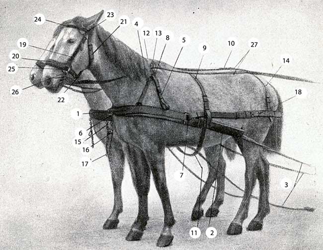 Das Einheits-Sielengeschirr besteht aus der Zugvorrichtung, der Verbindung, der Widerhaltvorrichtung und der Zäumung. |