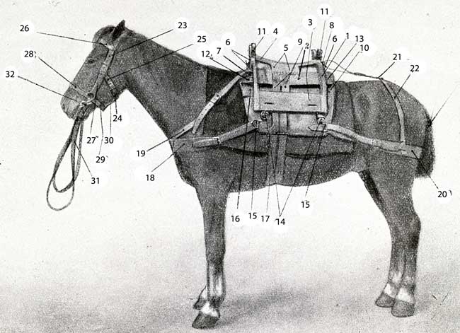 Knebel und dem doppelten Kreuzleitseil M.96. Die Halfter besteht aus dem Kopfriemen (23), dem Backenschnallstück (19), dem Nasenriemen (20), dem Kinnstruppen– und Kinnschnallenstücke, der Kinnschleife (22), dem Kehlriemen (21), dem Stirnriemen (24), sowie zwei großen (25) und einem kleinen Halfterring. Der Kopfriemen ist 85cm lang und 26mm breit. Das Backenschnallenstück, in das der Kopfriemen eingeschnallt wird, ist 25cm lang und 26mm breit. Der Nasenriemen ist 28cm lang und 45mm breit und trägt einen 26cm langen und 26mm breiten Aufsatz. Das Kinnstruppenstück ist 35cm lang und 26mm breit, das Kinnschnallenstück 11cm lang und 26mm breit. Alle bisher genannten Teile werden durch die beiden mit Lederflecken unterlegten großen Halfterringe, in die auch die Kettchen des Trensengebisses (26) durchgezogen sind, verbunden. Der Kehlriemen ist 110cm lang, 26mm breit und steht durch die 18cm lange und 26mm breit und steht durch 18cm lange und 26mm breite Kinnschleife mit den Kinnstruppenstücken in Verbindung. Der Stirnriemen, 46cm lang und 26mm breit, besitzt an beiden Enden zwei Schlaufen; durch die inneren (vorderen) Schlaufen läuft beiderseits der Kopfriemen, durch die äußeren (hinteren) Schlaufen der Kehlriemen. Überdies sind Kopf– und Kehlriemen am Kopfe des Pferdes durch eine 6,5cm lange, 26mm breite Doppelschlaufe verbunden. Am unteren Ende der Kinnschleife ist der kleine Halfterring eingenäht. Das Trensengebiß M.80 (26) ist aus Schmiedeeisen erzeugt, verzinnt und besteht aus dem gebrochenen Mundstücke, an dessen Enden, bewegliche ringe eingezogen sind. An letzteren ist je ein Kettchen mit Knebel angehängt. Das doppelte Kreuzleitseil M.96 (27) besteht aus zwei 205cm langen, 26mm breiten Leitzügeln, zwei 183cm langen, 26mm breiten Kreuzzügeln, zwei 200cm langen, 26mm breiten Handstutzen und einem 193cm langen, 26mm breiten Verbindungsriemen. Die vorderen mit Dornlöchern versehenen Enden der Leit– und Kreuzzügel tragen 20cm vom Ende Schnallen mit Schlaufen und werden in die Ringe der Trensengebisse eingeschnallt. Die Kreuzzügel besitzen am rückwärtigem Ende Schnallen, mit denen sie in die Struppen der Leitzügel eingeschnallt werden. Jeder Handstutzen hat vorne eine Schnalle mit Schlaufe, die mit der Struppe der Leitzügel verbunden ist, rückwärts drei festgenähte Schlaufen (Knöpfe) und ein Dornloch. Der Verbindungsriemen besitzt an beiden Enden je eine Schnalle mit Schlaufe zum Einschallen der rückwärtigen Enden der Handstutzen. |